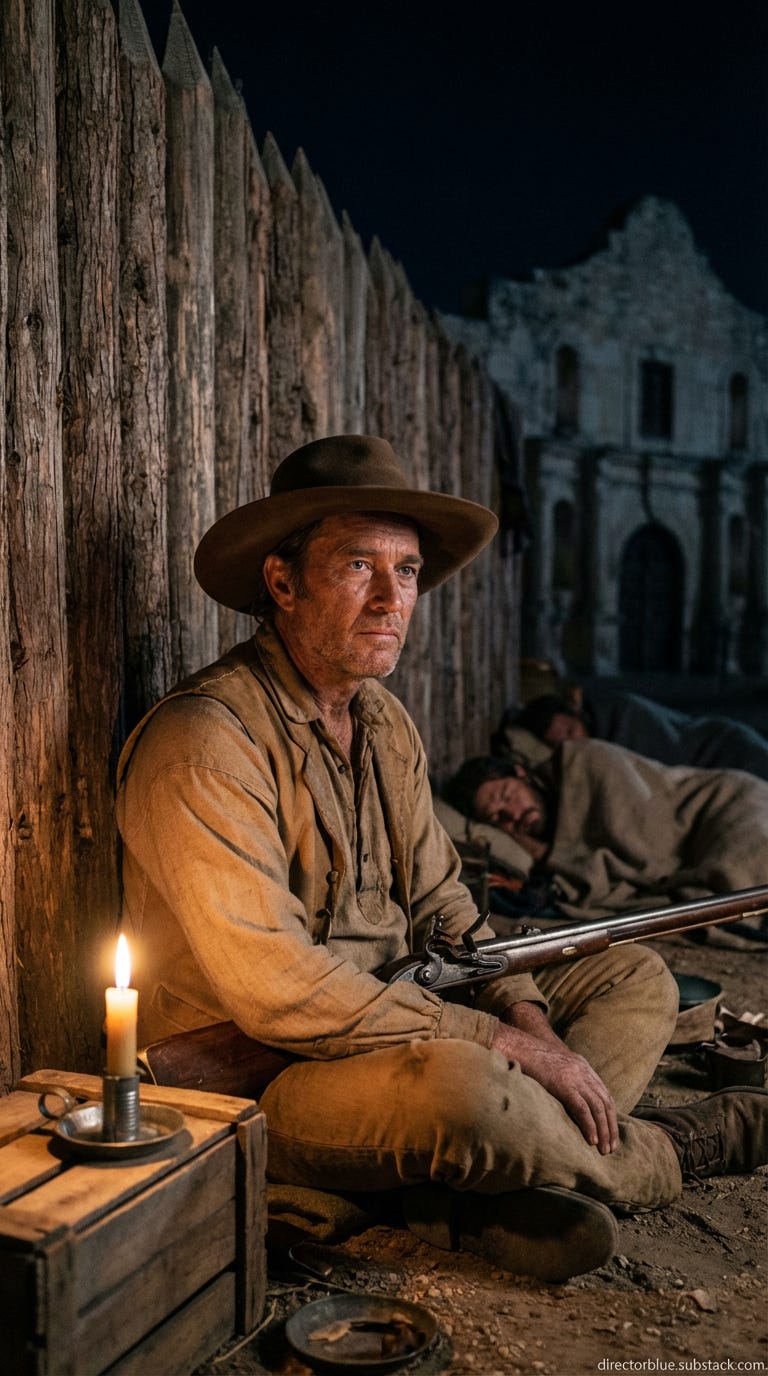The cold sits in the bones. You lean against the rough cedar post of the palisade, your breath a thin ghost in the dark. Old Betsy rests across your thighs, the steel barrel cold even through your wool trousers. Behind you, the chapel is a black shape against a blacker sky. A few men sleep in the dirt beside the low wall, curled around their rifles. You can smell the latrine trench, the old cook-fire ash, the faint sweetness of decay from a dead mule somewhere near the cattle pen. Somewhere to the north, a coyote. Nothing else. Thirteen days of cannon fire and now this silence — heavy, wrong. Your back aches. Your gums bleed when you press your tongue to them. You have not slept more than an hour at a stretch in four days. You think of your children in Tennessee and the thought is a splinter you cannot pull free.
