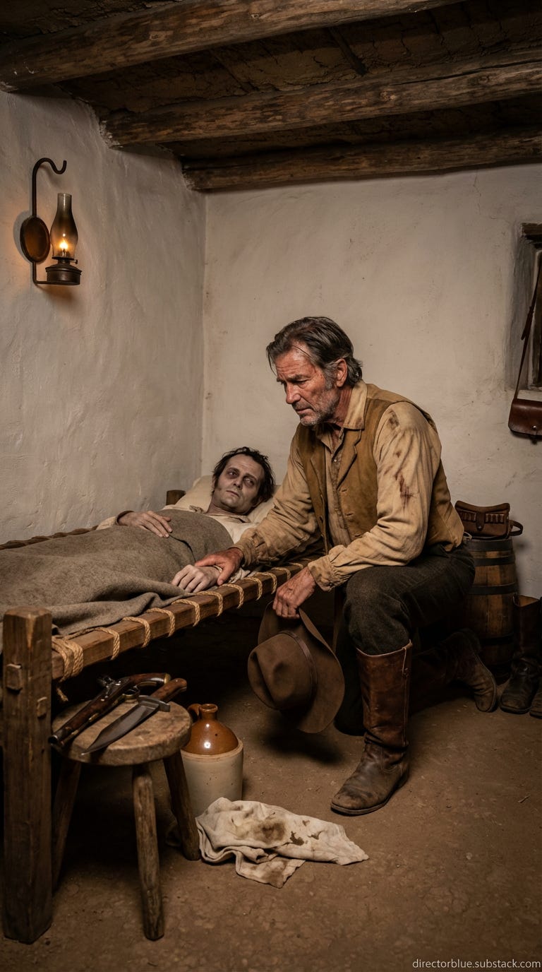 You duck through the low doorway into the barracks room where Bowie lies. The air is thick — sweat, sickness, the sharp smell of the poultice someone pressed to his chest. Jim Bowie, the most dangerous knife-fighter on the frontier, lies on a wooden cot against the adobe wall, a wool blanket pulled to his chin, his face the color of candle wax. His famous blade rests on a stool within reach. Two pistols are loaded beside him. He opens his eyes when you kneel. His voice is a dry rasp. He asks if you hear anything out there. You tell him nothing. Just the quiet. He says that is what troubles him. You grip his wrist — the skin is hot and papery — and you tell him you will see him on the other side of this. He manages something between a smile and a grimace. You do not believe your own words.