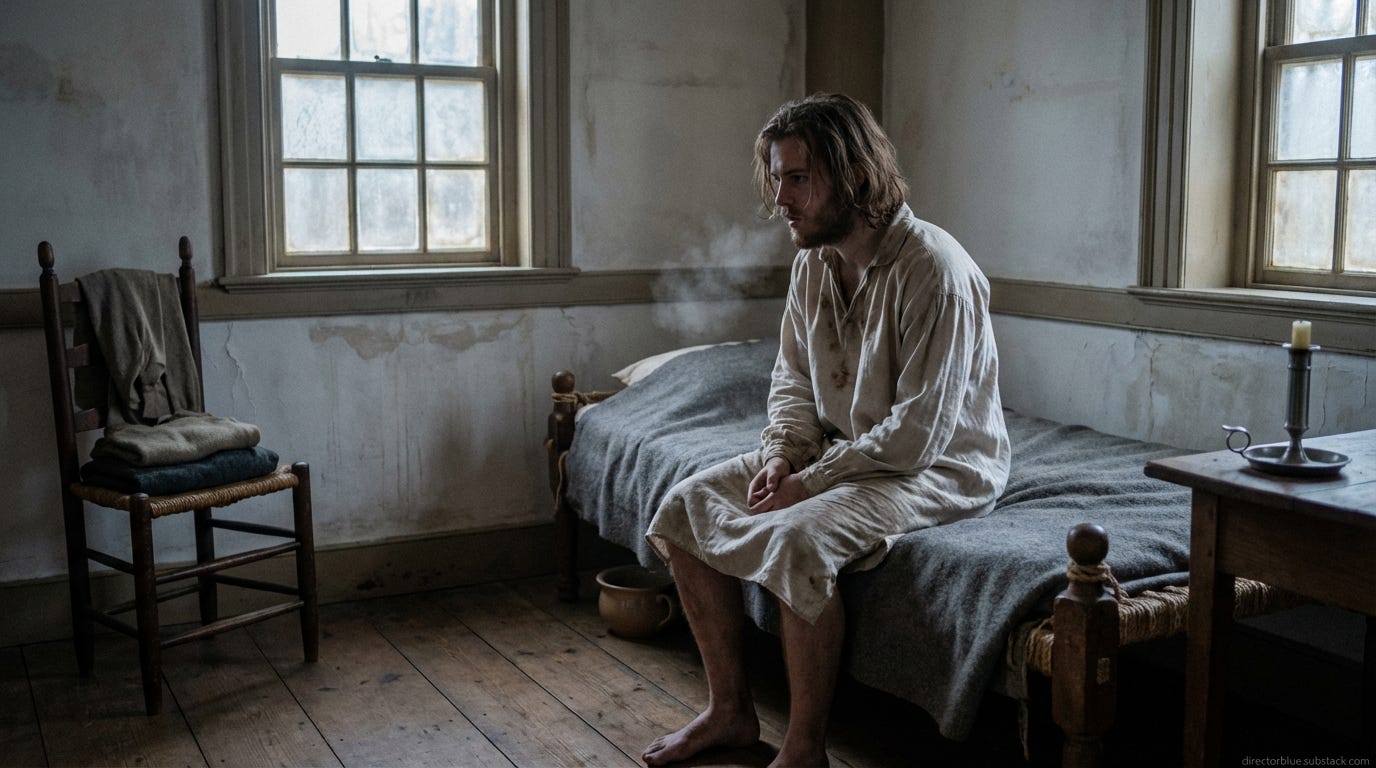 The creak of rope bed slats. Wool blanket heavy with the musk of months without washing. Gray light through oiled paper windows. The sharp ammonia of a chamber pot beneath the bed. Distant roosters. The tavern below still holding last night’s smoke — tobacco, tallow, spilled cider gone to vinegar. Cold pine floorboards. The young man’s breath visible in the chill as he rises, his linen nightshirt damp with sweat despite the cold.