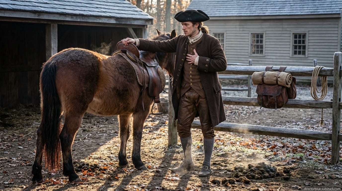 The stamp and blow of horses in the cold. Manure steaming in the morning air, its grassy fermented smell overwhelming. He saddles his bay mare — she is small, unremarkable, chosen specifically for her plainness. The leather of the saddle is cracked, mended with cord. Inside his waistcoat, sewn into the lining, a folded paper bearing nothing visible — the message written in James Jay’s invisible stain, readable only when treated with its counterpart reagent. His hands tremble slightly as he checks the hidden pocket. A British patrol passed through yesterday. He reminds himself: he is merely riding to New York to purchase supplies for his tavern. Coffee. Pins. Fabric.
