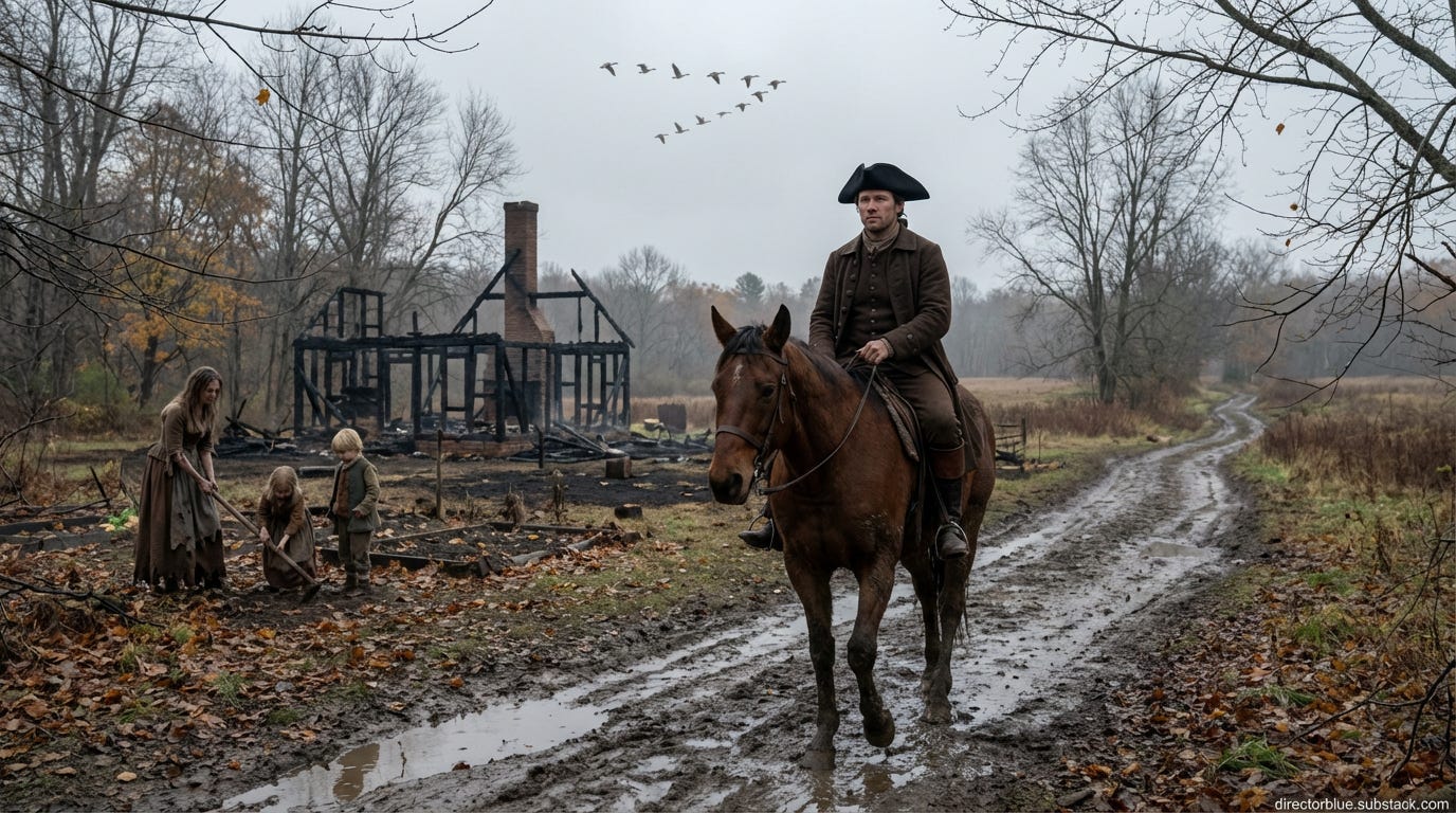 Fifty-five miles to New York City. The road is mud and ruts from autumn rains. His mare picks her way carefully. The smell of wet fallen leaves, woodsmoke from distant farmhouses, the occasional sharp decay of a dead animal in the brush. He passes a farmstead burned by British raiders — blackened timbers, a chimney standing alone. A woman and two children dig in the ruined garden for any remaining turnips. He does not stop. Cannot stop. A lone rider stopping draws attention. His stomach growls; he ate only cold johnnycake before leaving. Overhead, geese in formation heading south. The creak of leather. The rhythm of hooves.