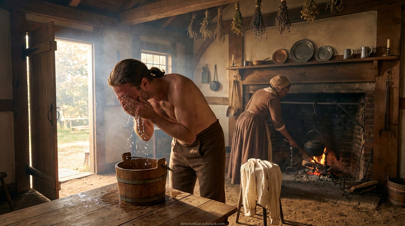Woodsmoke thick in the detached kitchen. An enslaved woman named Bett tends the fire, her back to him as she works. The hiss of water in an iron pot. The young man splashes frigid well water on his face from a wooden bucket, gasping. No soap — lye soap is scarce. He scrubs his teeth with a frayed birch twig dipped in salt. The taste of brine and wood fiber. He pulls on his clothes layer by layer: linen shirt still carrying his body’s history, wool stockings with darned heels, leather breeches stiff with age.