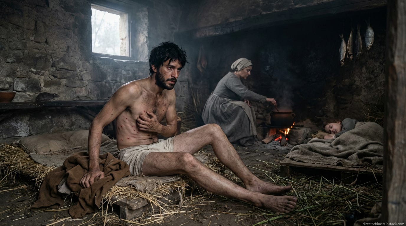 The young man wakes on a straw pallet crawling with lice, in a single-room stone hovel he shares with his mother and twelve-year-old sister. The air is thick with the smell of old fish, woodsmoke, and human bodies unwashed for weeks. A rat scurries along the wall. Through the single unglazed window, the pre-dawn light is gray. His mother is already up, stirring yesterday’s bean pottage over a small hearth. She coughs—she always coughs. Marco scratches at fleabites on his ribs, pulls his rough wool tunic over his head, and prepares to walk to the harbor for the day’s labor.