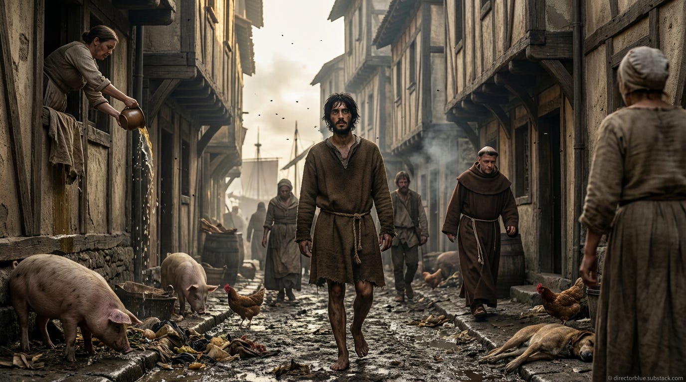 Our subject is Marco di Ferrante, age nineteen, a facchino (dockworker) and the son of a deceased fisherman, who lives with his widowed mother and younger sister in the cramped, foul-smelling lanes behind the Messina waterfront. He wears a coarse brown wool tunic, much-mended, rope-belted, with rough linen braies beneath, and goes barefoot as leather is beyond his means. He has not bathed in weeks; none of his class do. Today, he will unload cargo from the East—and witness the end of his world.