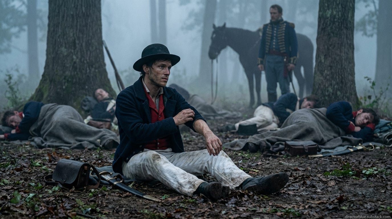 The first gray light filters through the humid air as Samuel wakes on bare ground, his wool jacket damp with dew. Around him, men of the flotilla stir beneath a scattered canopy of white oak. There is no coffee, no fire—only cold salt pork and hardtack passed hand to hand. Somewhere beyond the trees, the distant rumble of drums. A horse whickers. Samuel scratches at the fleabites on his forearms, adjusts the tarred queue tied at his neck, and checks the priming on his pistol. His feet, already blistered from three days of marching, ache inside his low buckled shoes. An officer moves through the sleeping forms, speaking quietly: The British are on the march. We move within the hour.
