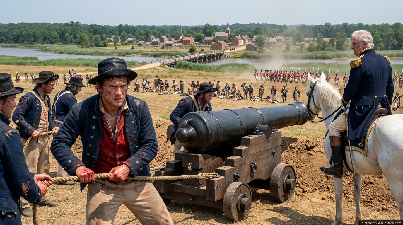 Samuel crouches behind an earthen embankment, helping to unlimber one of Commodore Barney’s 18-pounder cannons. The heavy iron beast weighs over two tons; his palms bleed from the ropes. Below, the wooden bridge spans the shallow Eastern Branch of the Potomac—muddy water barely three feet deep, bordered by marsh reeds. Across the river, he can see the first red flickers of British columns emerging from the treeline at Bladensburg village. Their bayonets catch the sun like needles. American militia fill the low fields between him and the bridge—farmers in civilian clothes, boys clutching muskets too heavy for them. Samuel counts perhaps 6,000 men, but they look more like a crowd at a county fair than an army. Barney arrives on horseback, white-haired and fierce, his blue coat immaculate despite the heat. He dismounts, inspects the cannon, nods once at Samuel: Hold your fire until you see their eyes, son.