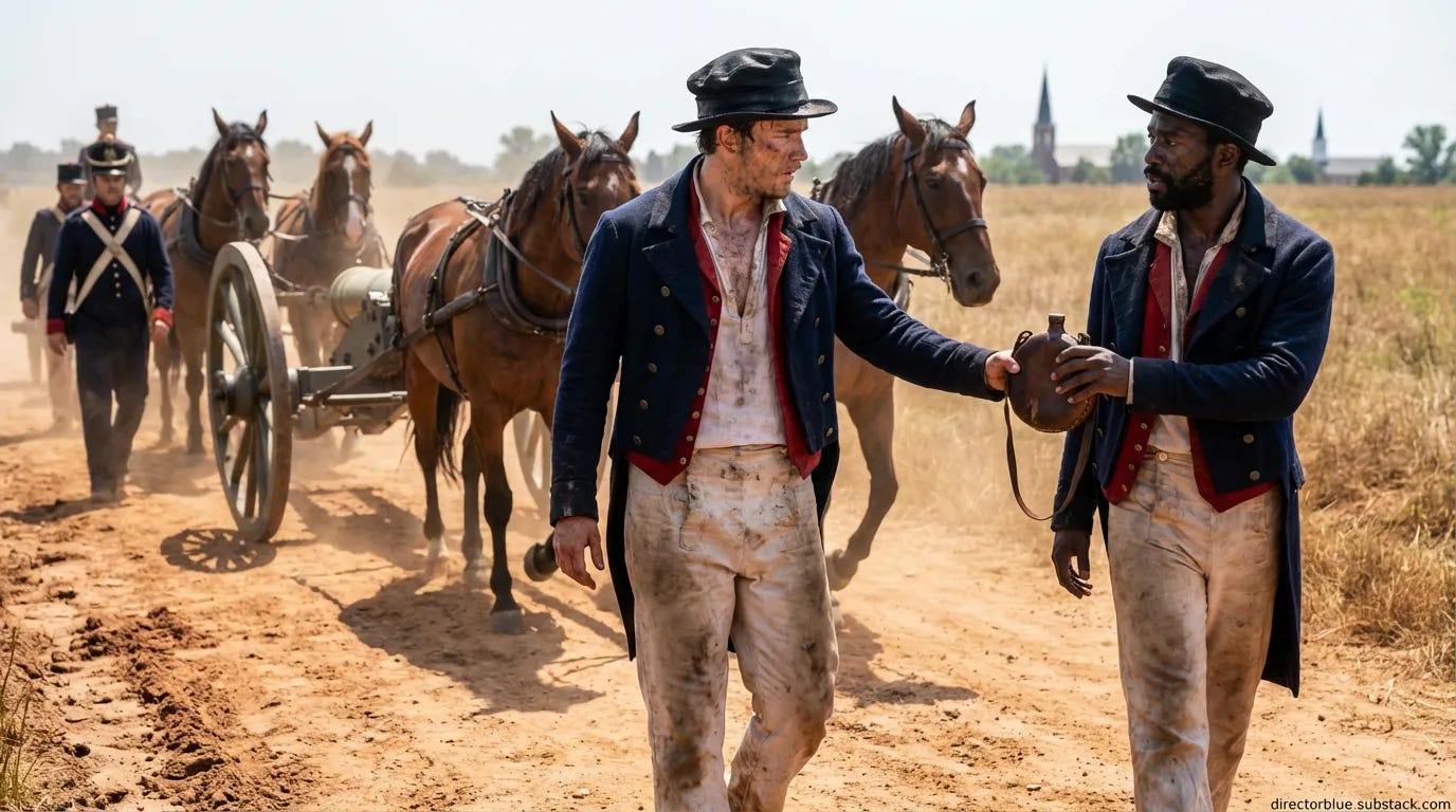 The column has been marching for hours under a punishing sun. Samuel’s shirt is soaked through beneath his jacket; he can feel the salt crust forming on his collar. The temperature climbs past 95 degrees. Men ahead of him stumble, fall out, vomit from heat exhaustion. The road is rutted and choked with dust that coats everything—skin, teeth, the iron of his cutlass hilt. He pulls behind a Navy gun carriage drawn by four lathered horses, their flanks dark with sweat. A marine beside him—a black man named James, one of the free men who joined at Baltimore—passes him a leather canteen. The water is warm as blood. Ahead, the town’s church steeples rise above fields of dry brown grass. Gunfire crackles somewhere to the north. An officer shouts: Double-quick, men! We’re needed at the bridge!