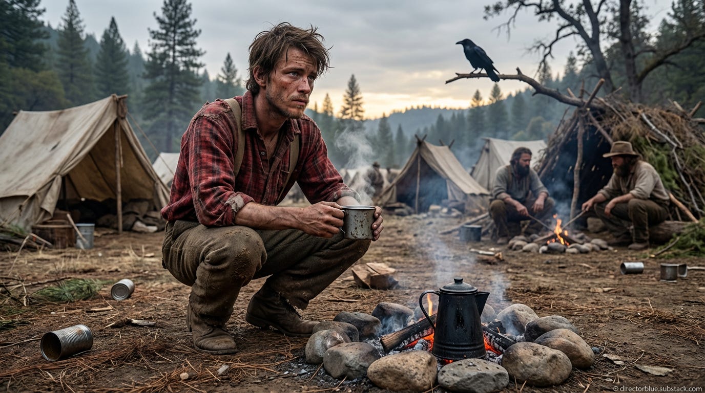 Smoke rises from a dozen small fires dotting the ravine as men emerge from tents and lean-to shelters. The smell of burning pine mingles with boiling coffee—a bitter, scorched aroma from beans roasted in a pan and crushed with a rock. The coffee is more chicory than bean, but it is hot. A man nearby hawks and spits a thick wad of phlegm into the dirt. The tin cup burns the fingers. A raven calls from a skeletal oak, and picks at something unidentifiable near the latrine ditch.