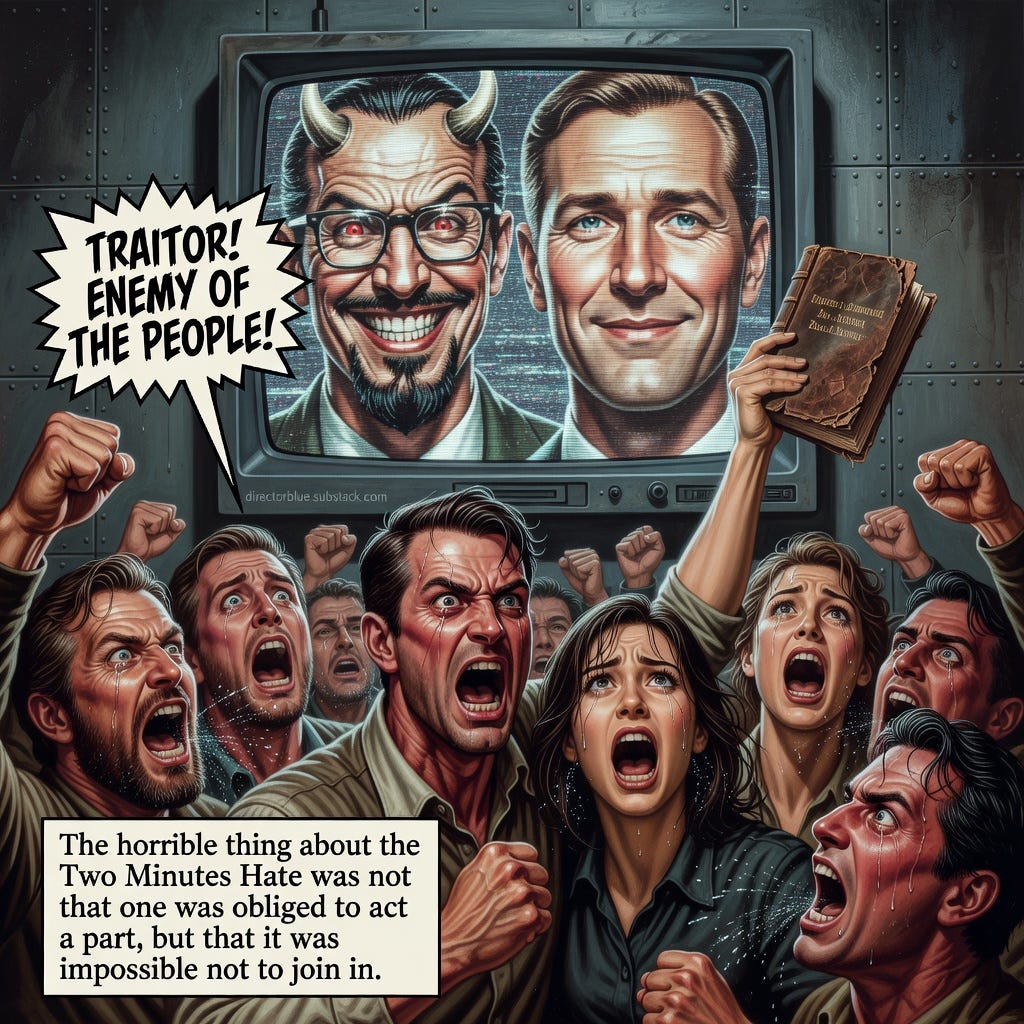 Every day, the Party makes everyone stop what they’re doing and watch a video of their so-called enemy, a man named Emmanuel Goldstein. And every day, the crowd goes absolutely insane — screaming, throwing things, red-faced with rage. It’s like a organized tantrum. The trick is that the anger is real. People’s lives are miserable, and the Party gives them someone to blame — someone who isn’t the Party. Winston plays along because he has to, but he notices something scary: even knowing it’s all fake, he still feels the hate pulling at him. The scariest part of propaganda isn’t that people pretend to believe it. It’s that eventually, they actually do.