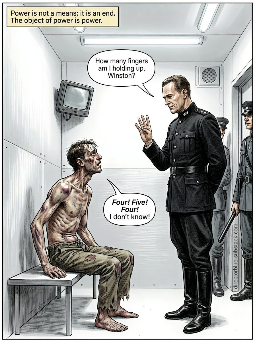 Winston is locked in a bright white cell that never goes dark, inside a building called — with typical Party irony — the Ministry of Love. O’Brien, the man he trusted, is now his torturer. But O’Brien doesn’t just want Winston to say what the Party wants. He wants Winston to truly believe it. He holds up four fingers and demands Winston see five. Not pretend to see five — actually see five. The Party’s goal isn’t just to make people obey. It’s to reach inside their heads and change how they see reality itself. If the government says two plus two equals five, then it equals five. That’s the level of control they’re after.