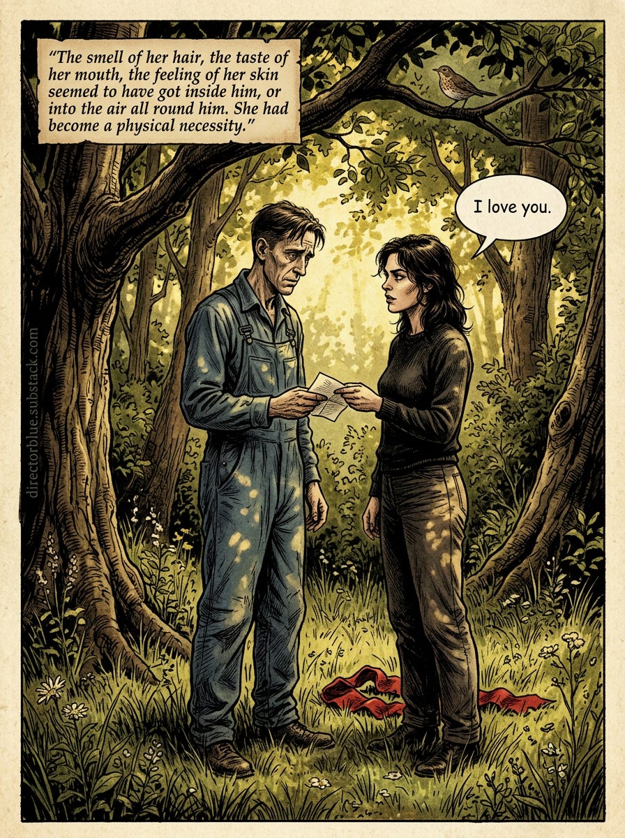 In a world where the government controls who you’re allowed to love, Julia tells Winston something that counts as an act of rebellion: “I love you.” The two of them meet in a hidden spot in the countryside, far from the cameras and screens. The Party doesn’t want people forming real emotional connections because love makes people loyal to each other instead of to the government. Out here, with birds singing and wildflowers growing, Winston feels something he was told didn’t exist anymore — genuine happiness. But this feeling will eventually be used as a weapon against him.