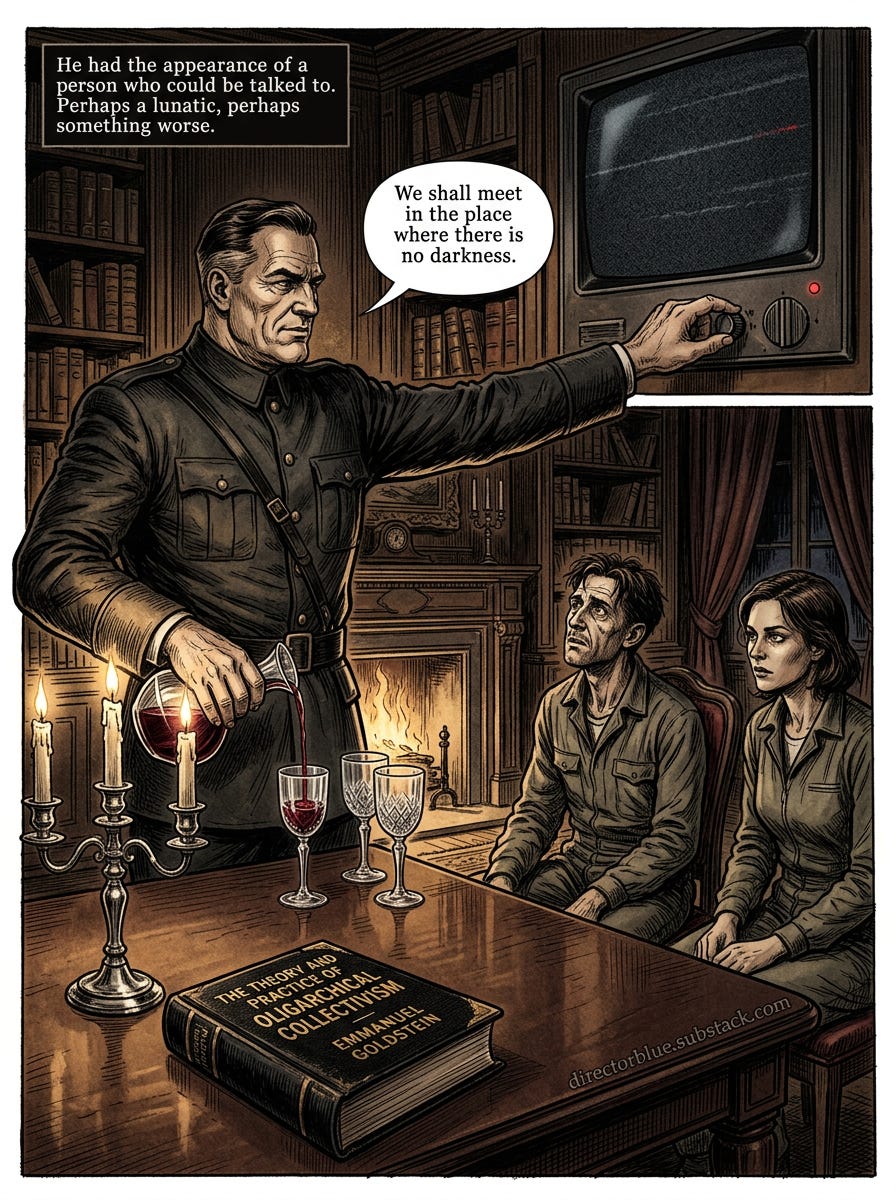 A powerful Party official named O’Brien invites Winston and Julia to his apartment and tells them what Winston has been desperate to hear: there’s a secret resistance movement, and they can join it. O’Brien pours them real wine, gives them a forbidden book, and even turns off the surveillance camera in his home — something Winston didn’t know was possible. Winston is so hungry for hope that he believes every word. He doesn’t realize that O’Brien is not a rebel — he’s the Party’s most effective hunter. The “place where there is no darkness” that O’Brien promises isn’t a metaphor for freedom. It’s a prison cell where the lights never turn off.
