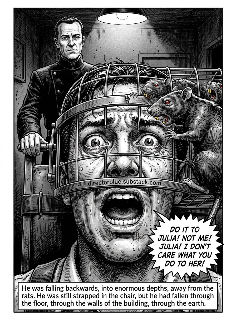 Room 101 is where they take you to face the thing you fear most in the world. For Winston, that’s rats. They strap a cage of starving rats to his face and tell him the cage is about to open — unless he gives them what they want. And what they want is for him to betray Julia. Not just say the words, but mean them with every cell in his body. And he does. He screams for them to do it to her instead. In that moment, the Party wins. They’ve reached into the deepest part of who Winston is — his love for another person — and destroyed it. There’s nothing left within him that the government doesn’t own.