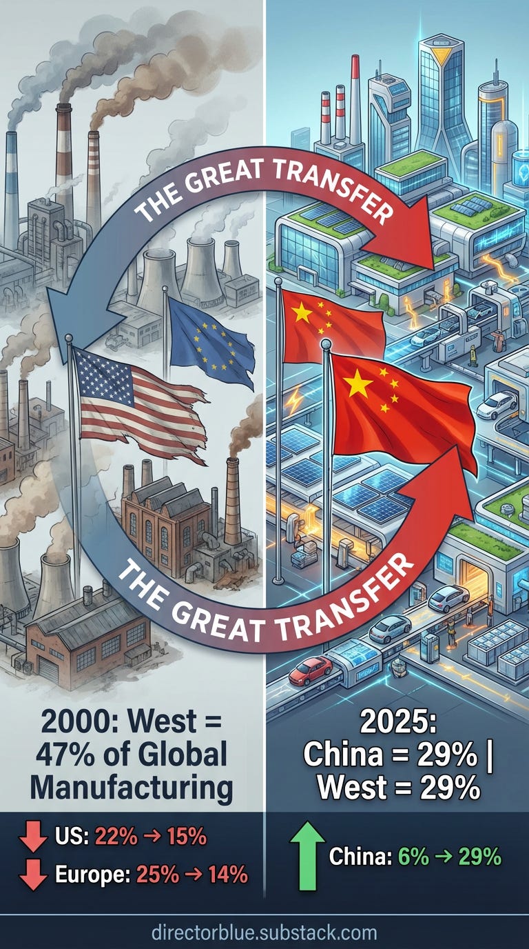 In the year 2000, the United States and Europe combined controlled nearly half of global manufacturing output—a position built over a century of industrial development. China, still emerging from decades of isolation, held just 6%. Twenty-five years later, that order has been completely inverted. China now commands 29% of global manufacturing value-added ($4.8 trillion annually), while the combined US-Europe share has fallen to roughly the same figure. This wasn’t a gradual shift—it was an avalanche triggered by policy choices. As Western nations implemented environmental regulations that raised energy costs and outsourced “dirty” production, China positioned itself as the willing recipient of that industrial capacity.