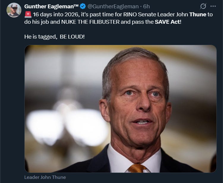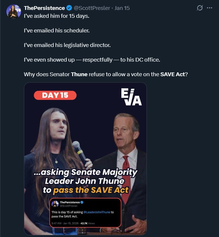 John Thune’s number is 1-202-224-2321 (DC) and 1-605-334-9596 (Sioux Falls). Be polite. Be firm. Pass the SAVE Act to save America.