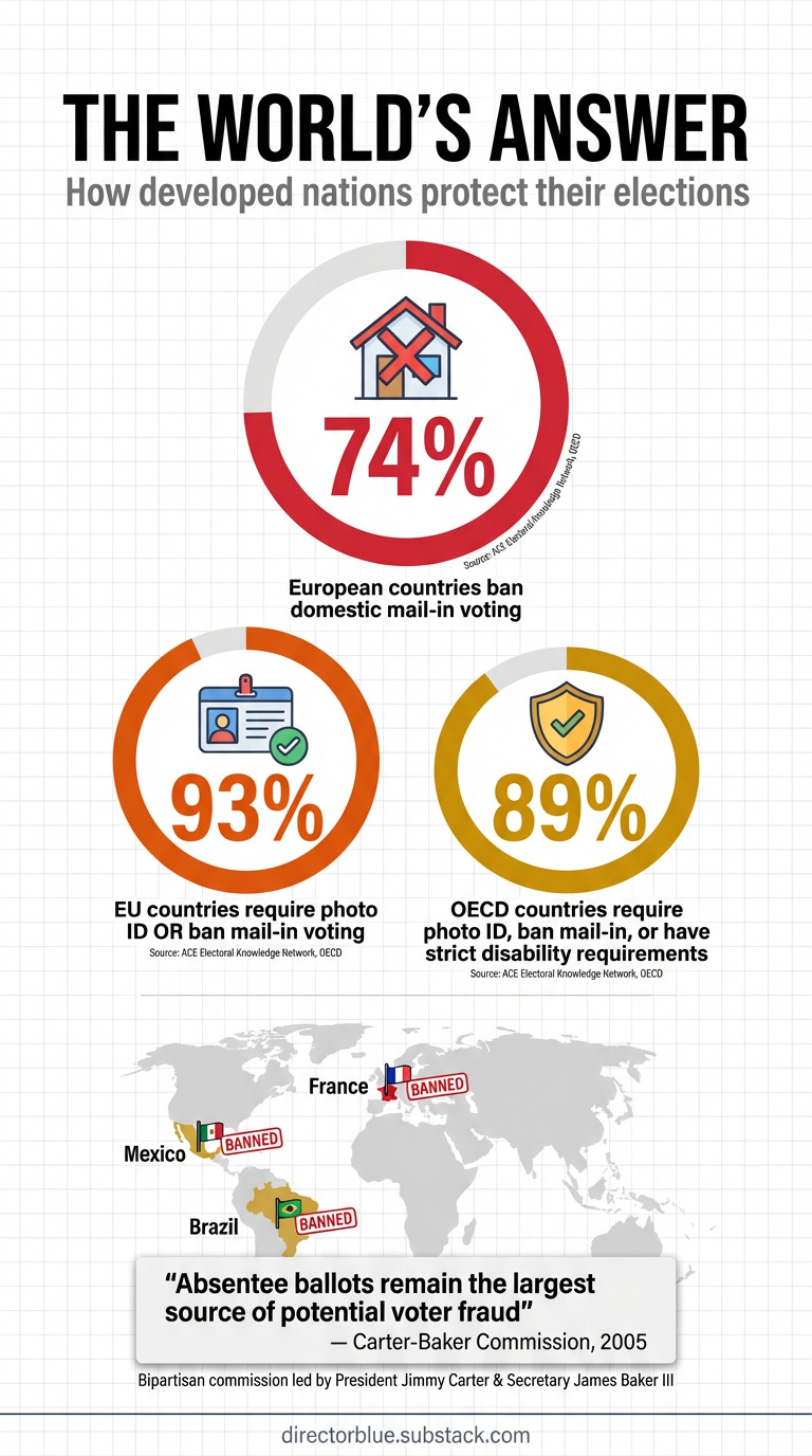 The numbers tell an unambiguous story. In the European Union, 93% of member nations either ban domestic mail-in voting or require photo identification to obtain a ballot. Across all of Europe, that figure reaches 95%. Among OECD countries—the world’s most developed economies—89% impose strict requirements: photo ID, outright bans, or limitation to disabled voters only. Even the 2005 Carter-Baker Commission, led by Democratic President Jimmy Carter and Republican Secretary of State James Baker III, concluded that “absentee ballots remain the largest source of potential voter fraud.”