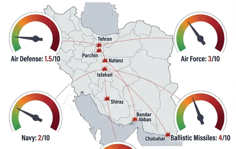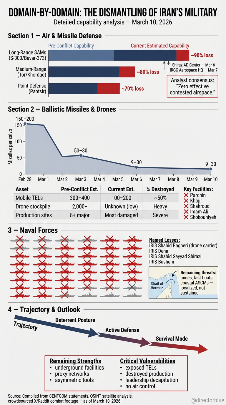 By March 10, 2026, Iran’s integrated military defense network has suffered catastrophic, multi-domain degradation under sustained US-Israeli strikes. Air defense systems are rated at just 1–2 out of 10 by open-source analysts, the air force is effectively nonexistent, naval assets have lost over 30 vessels, ballistic missile launch rates have collapsed by about 90 percent, and senior leadership — including the Supreme Leader — are dead or in hiding. What remains is a fragmented force operating in survival mode: sporadic missile launches from hidden mobile units, residual small craft in the Gulf, and proxy networks that continue to operate at diminished capacity. In short, the military establishment has shifted from deterrence posture to existential crisis in under two weeks.
