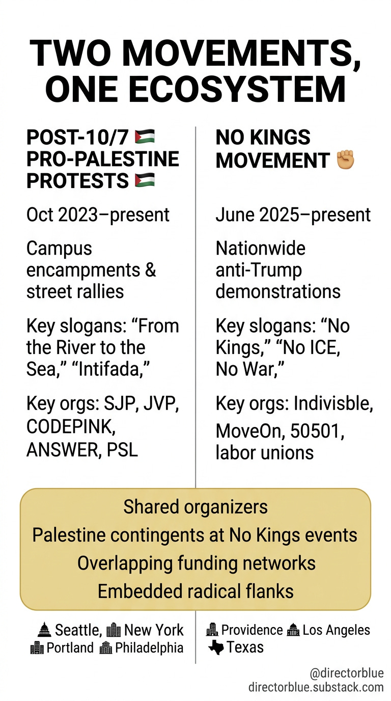 Two of the largest protest movements in recent American history share more DNA than most people realize. The pro-Hamas Terror rallies that erupted after October 7, 2023 were organized by groups like Students for Justice in Palestine, Jewish Voice for Peace, CODEPINK, and the ANSWER Coalition. The No Kings movement, which has mobilized millions against the Trump administration since 2025, is led by mainstream progressive organizations like Indivisible and MoveOn. But in city after city—Seattle, New York, Portland, Los Angeles, Philadelphia, and others—the same activist groups from the post-10/7 wave have embedded themselves inside No Kings events, creating dedicated “Palestine contingents” and injecting anti-Israel messaging into their “anti-authoritarian” movement.