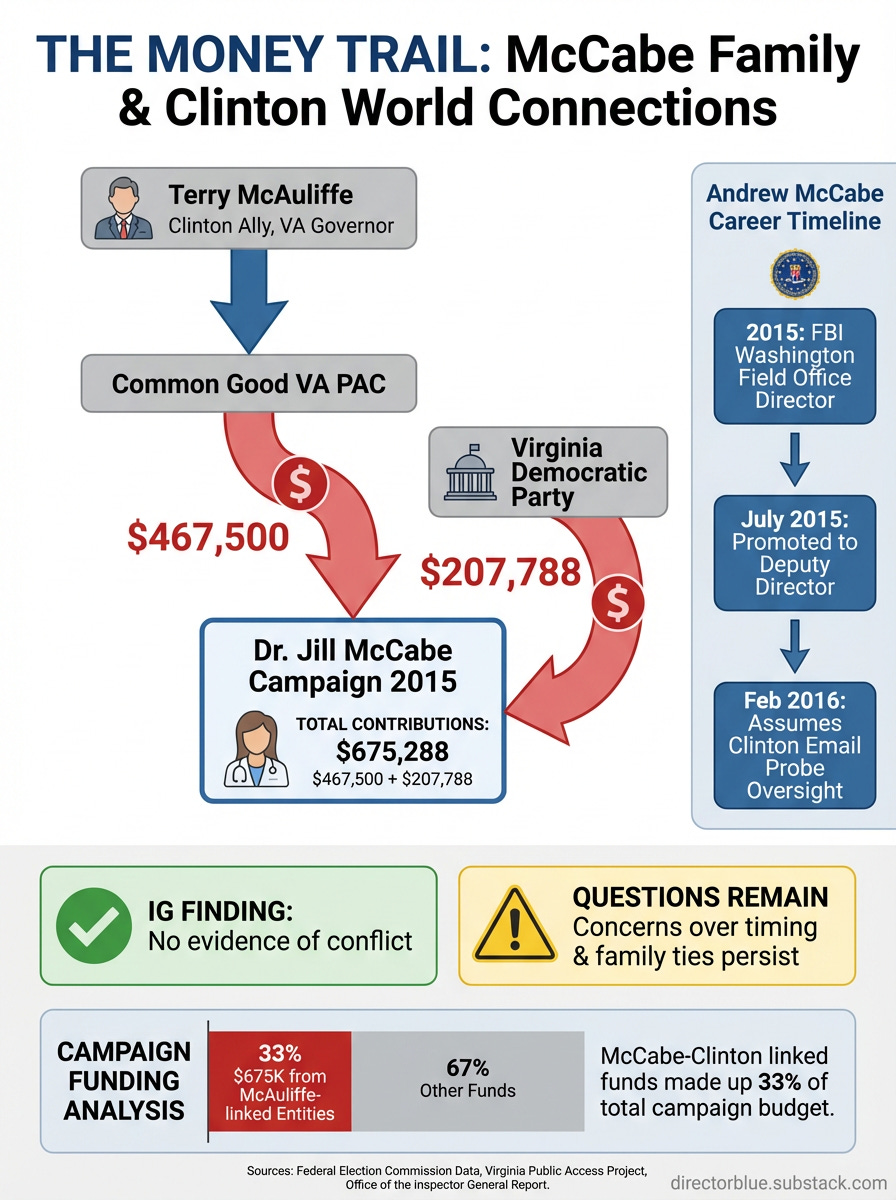 In 2015, Dr. Jill McCabe received over $675,000 in campaign contributions from sources directly tied to longtime Clinton allies—funds that comprised more than a third of her entire state Senate campaign war chest. Her husband Andrew McCabe was promoted to FBI Deputy Director during this campaign and later assumed oversight of the Clinton email investigation just months after her campaign ended. While internal reviews cleared McCabe of formal wrongdoing, the timeline raises fundamental questions about institutional firewalls: Can the American public trust that the nation’s top law enforcement officials remain insulated from political influence when their families receive six-figure donations from subjects’ political networks?