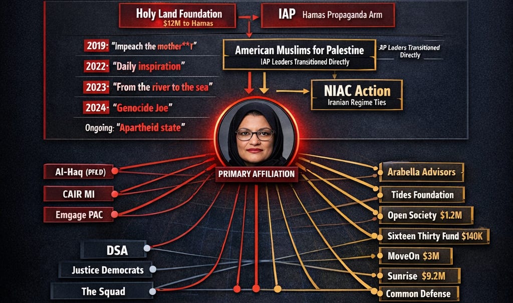 Every member of Congress builds a network of supporters and partners. But Rep. Rashida Tlaib’s network includes financiers connected to Hamas, Iranian Mullah lobbying groups, and the typical Soros-style “dark money” groups.